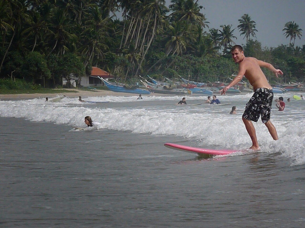 An der Südküste Sri Lankas zwischen Galle und Matara liegt das kleine Örtchen Weligama, das bekanntgeworden ist durch seine Stelzenfischer. Weligama an sich bietet relativ wenig und ist nicht sonderlich schön. Da ist der Nachbarort Mirissa mit seiner schönen Bucht und den vielen Bars doch wesentlich interessanter. Allerdings ist Weligama bestens geeignet, um Eure ersten Surfstunden zu nehmen. Der lange Strand verläuft relativ flach, man kann lange stehen und die Wellen sind hier nicht so groß und hart, wie die in Mirissa. Erreichen könnt ihr Weligama ohne Probleme mit dem Roller ab Mirissa.