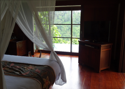 Unsere Panoramic Villa war wirklich wunderschön. Die knapp 100qm große Villa besteht aus einem großen Schlafraum mit riesiger Panoramascheibe für den Blick über den privaten Pool hinweg ins Tal und einem sehr großen Badezimmer. An Ausstattung wird hier natürlich allerlei geboten: Vom großem Flat-Screen (wer´s braucht…) über Badewanne, bis hin zu einem Bluetooth-fähigem Soundsystem von Bose (damit haben wir unsere Villa natürlich schön beschallt ;-)).