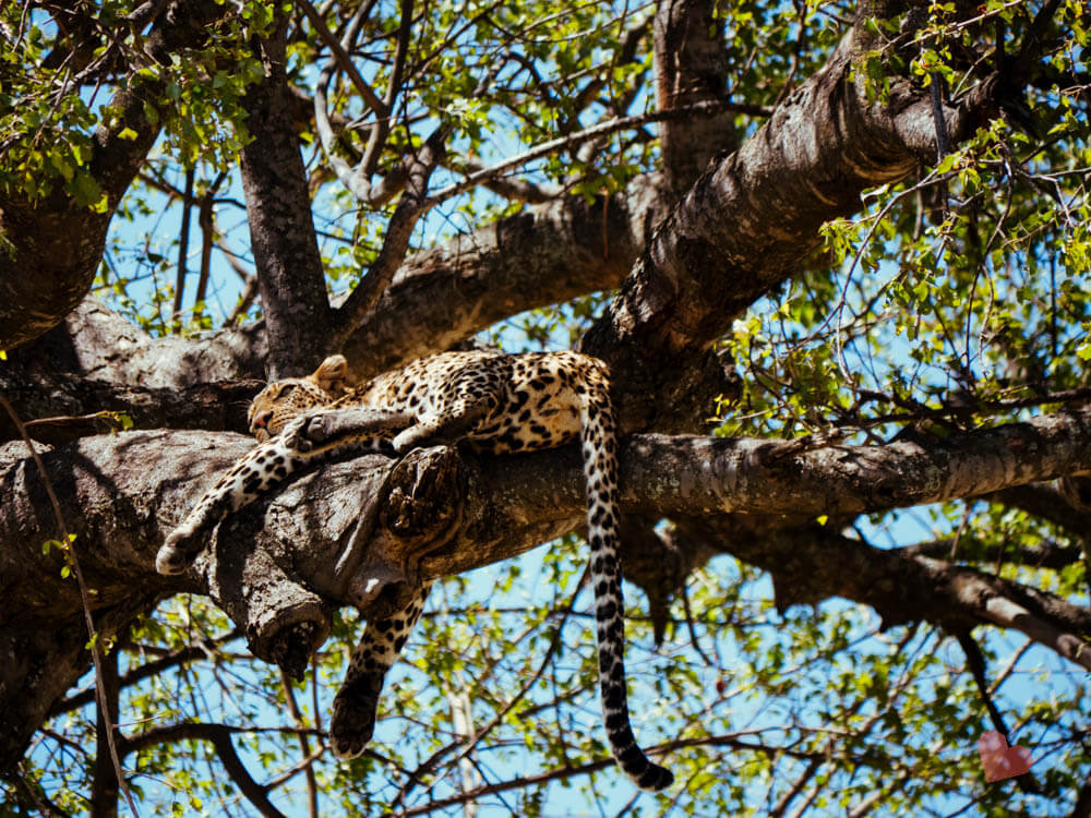 Kurze Zeit später entdeckten wir eine Leopardin, die sich hervorragend versteckt hielt. Wir hätten sie fast übersehen vor der Felswand. Godlove war sich ziemlich sicher, dass die Leopardin kleine Babys hat und diese ganz in der Nähe sein müssten. Wir fuhren deshalb in der Nähe zu einem Baum und siehe da: auf dem Baum lag ein kleines Leopardenbaby.