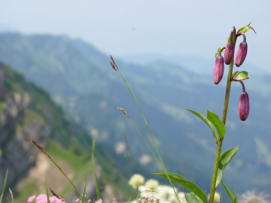 Geschafft, verschwitzt und mit schweren Beinen kommt ihr nun am höchsten Punkt der Nagelfluhkette an. Leider ist durch die nahegelegene Hochgratbahn am Hochgrat-Gipfel ziemlich viel los und man kann das erreichte Ziel nicht so richtig genießen. Deswegen empfehlen wir Euch an einem der vorherigen Gipfel Rast zu machen um das wunderschöne Panorama zu genießen. Denn hier tummeln sich nun nicht nur fleißige Wanderer, sondern auch jede Menge Touris in Sandälchen und Turnschuhen, die den 25 minütigen Aufstieg von der Bahn zum Gipfel in Angriff genommen haben.